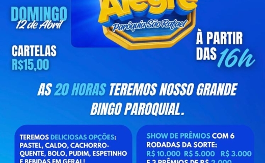 O ponto alto da noite será o tradicional Bingo Paroquial, com início previsto para as 20h, oferecendo ao público a chance de concorrer a prêmios em dinheiro distribuídos em seis rodadas. Entre as premiações estão valores de R$ 10 mil, R$ 5 mil, R$ 3 mil, além de três prêmios de R$ 2 mil, totalizando uma expressiva premiação.